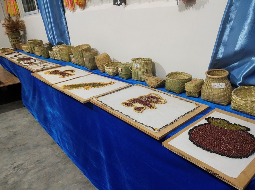 富邦乡中心小学是我这次调研的最后一个乡镇,富邦乡位于澜沧县西北部,国道214线在乡境内经过,距县城64公里,境内**海拔2436米,由于对路线不熟悉且山路崎岖,到达学校已是下午6点,而校长罗海波已等候我们多时,看到罗校长的**印象是衣着朴素、皮肤黝黑、面善的中年男人。虽然是下午6点多,但是我们马上对学校校园文化的现状以及未来校园文化建设的思路进行了深入讨论,谈到学校现有的文化建设情况以及校长对文化建设方面做了哪些工作,罗校长顿时表情凝重,后又露出了朴实的笑容,他没有回答我们,而是带我去一个地方,那里有我们全校师生的智慧和欢乐,当然还有满满的期望,也可以说是他们引以为豪的传统文化教育的传承践行,也是孩子们创新能力的体现,还是孩子们动手动脑能力锻炼的具体成果,听他这么介绍,我立即对要去的这个地方充满了好奇心,这到底是什么地方呢?很快罗校长将我们带进一个教室大小的房子,房子墙面刷白,中间布置有简单的展架,展架上放着精美的竹编工艺品,还有平放着独具特色的种子装饰画,白色的墙面也挂满了各种各样的编织工艺品,罗校长面带自豪的笑容,说到这里都是孩子和家长一起完成的工艺品,有不同民族的背包、乐器和日常用品,这些画儿都是用五谷杂粮拼接而成,没有谁的帮助,是孩子们凭着自己的想象力创造力制作而成的,其中粗糙一点竹器是孩子制作的,光滑的是家长帮忙加工的,竹筐类的是老师们把竹子削好,再让孩子们用瓦片修磨光滑后在编制而成,每一个手工艺品上都写着它的名字和孩子的名字。
